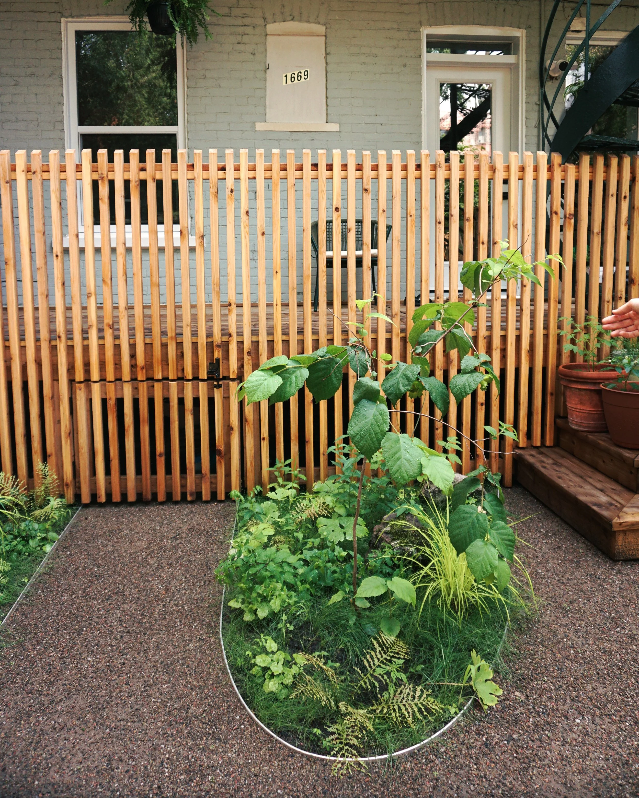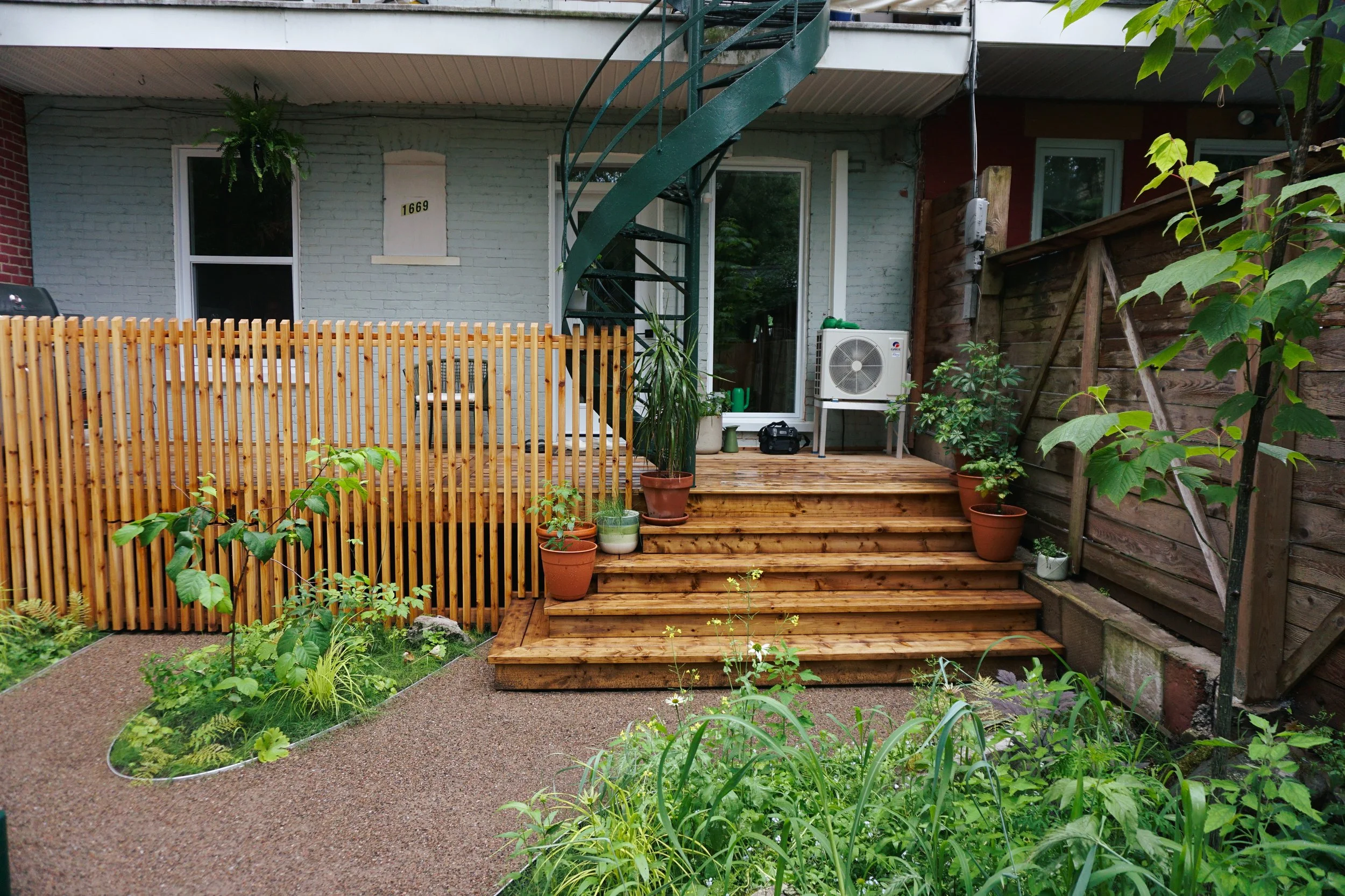 Élaboré en collaboration avec Nouveaux voisins, ce projet de jardin comprend l’aménagement d’une clôture de pruche, l’agrandissement du balcon, le travail du sol et de nivelage du terrain, l’installation de pavé et de sentiers de criblure de pierre ainsi que la création de plate-bandes pour la biodiversité.