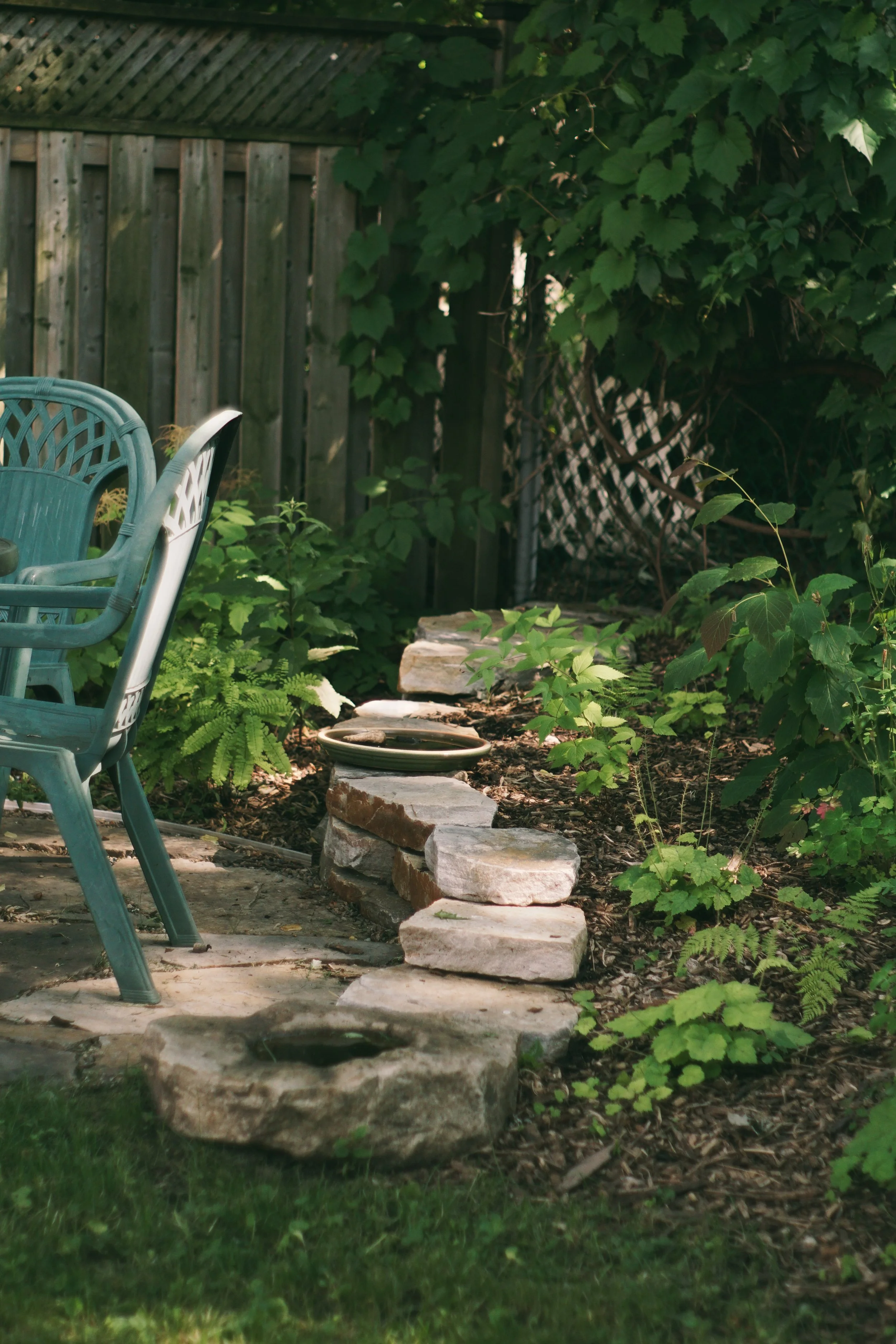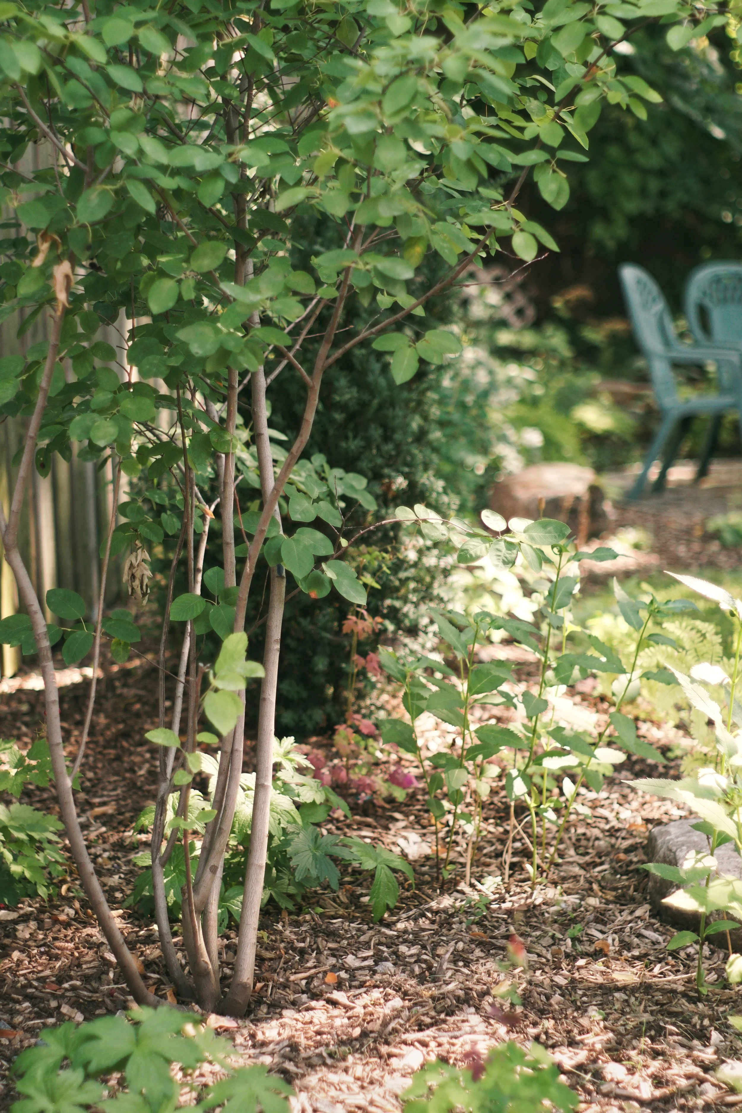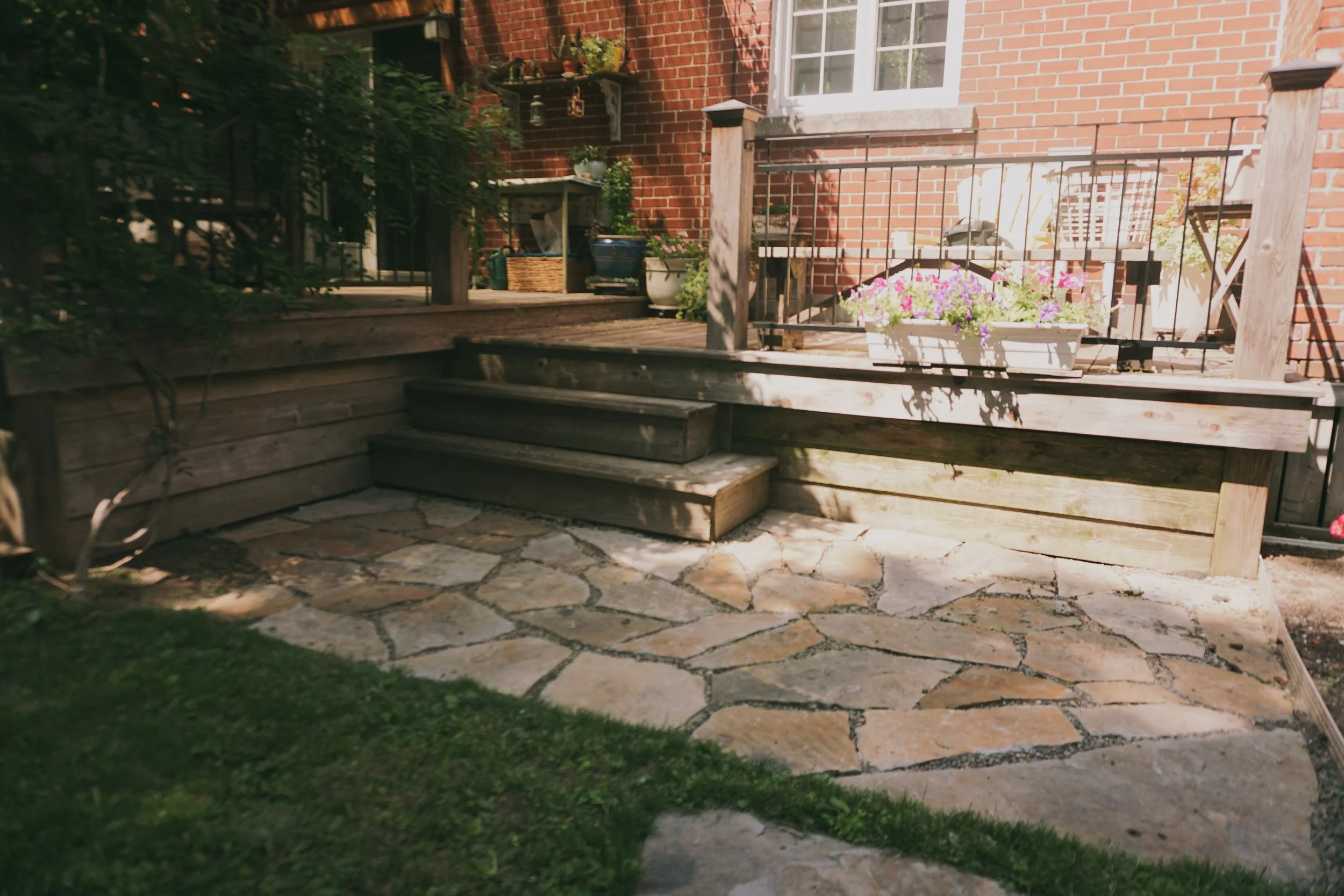 Propriétaire d’une immense cour en plein cœur du quartier Rosemont et à proximité d’un boulevard urbain achalandé, Johanne souhaitait rendre plus intime cet espace extérieur. Notre proposition repose alors sur la création de différents sous-espaces dans la cour (coin lecture, repas, sieste, BBQ), réduisant ainsi l’effet d’ampleur. De nouvelles plates-bandes ont été définies et une sélection végétale a été choisie spécifiquement pour ce jardin d’ombre. Des sentiers de pas japonais ainsi que différentes terrasses furent aménagés en pierres afin de s’intégrer à l’aspect naturel souhaité pour la cour.